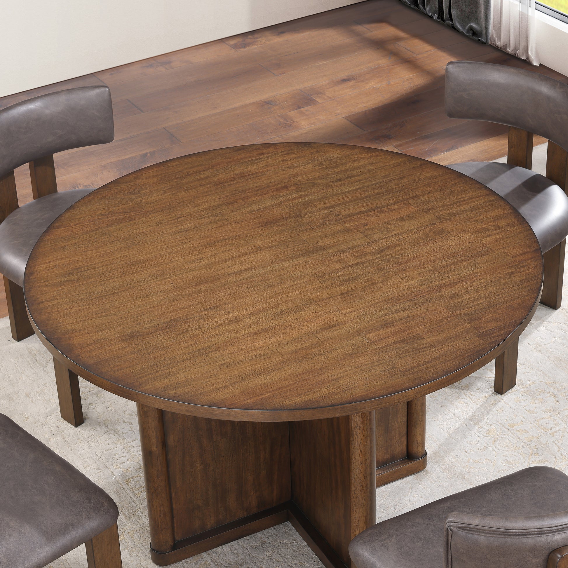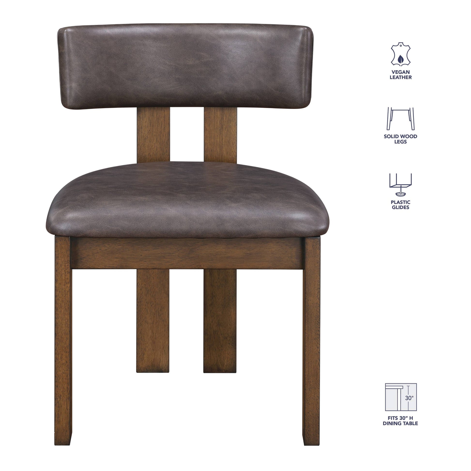 The Cambridge Side Chair blends clean, modern lines with warm, rustic appeal. Crafted from solid Asian hardwoods with a burnished chestnut finish, the chair features a comfortably padded seat and curved backrest upholstered in rich, dark brown vegan leather. The supple faux leather offers the look and feel of genuine hide with added durability and easy care. Its minimalist silhouette and earthy tones make it a versatile choice for dining rooms, game tables, or casual seating areas—perfectly complementing both contemporary and transitional décor.
