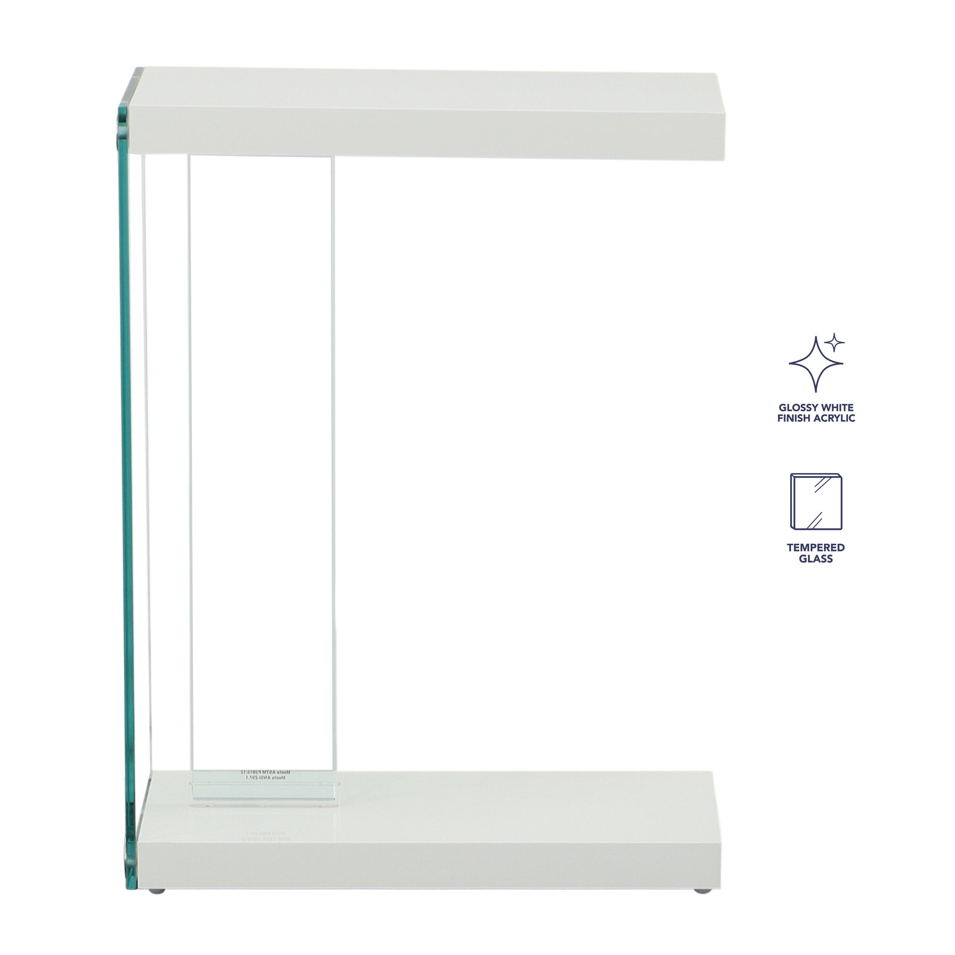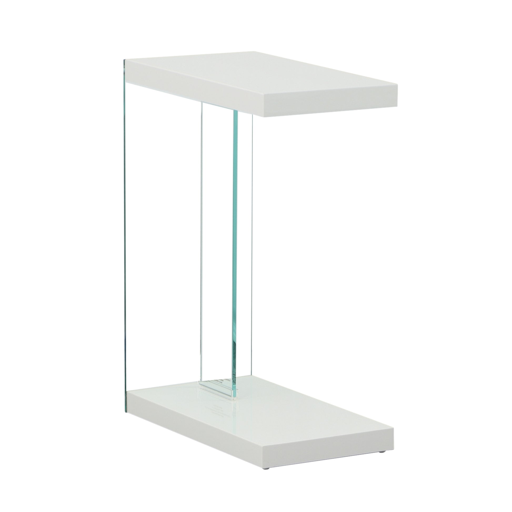 The Elaina Chairside End Table presents a light airy form in an extremely functional “C” table configuration. The Glossy White finish complements any contemporary environment and the tempered glass and acrylic supports give the table a light footprint that is easy to decorate around. Use beside an upholstered piece or pull under the front of a sofa or loveseat for an instant work area.