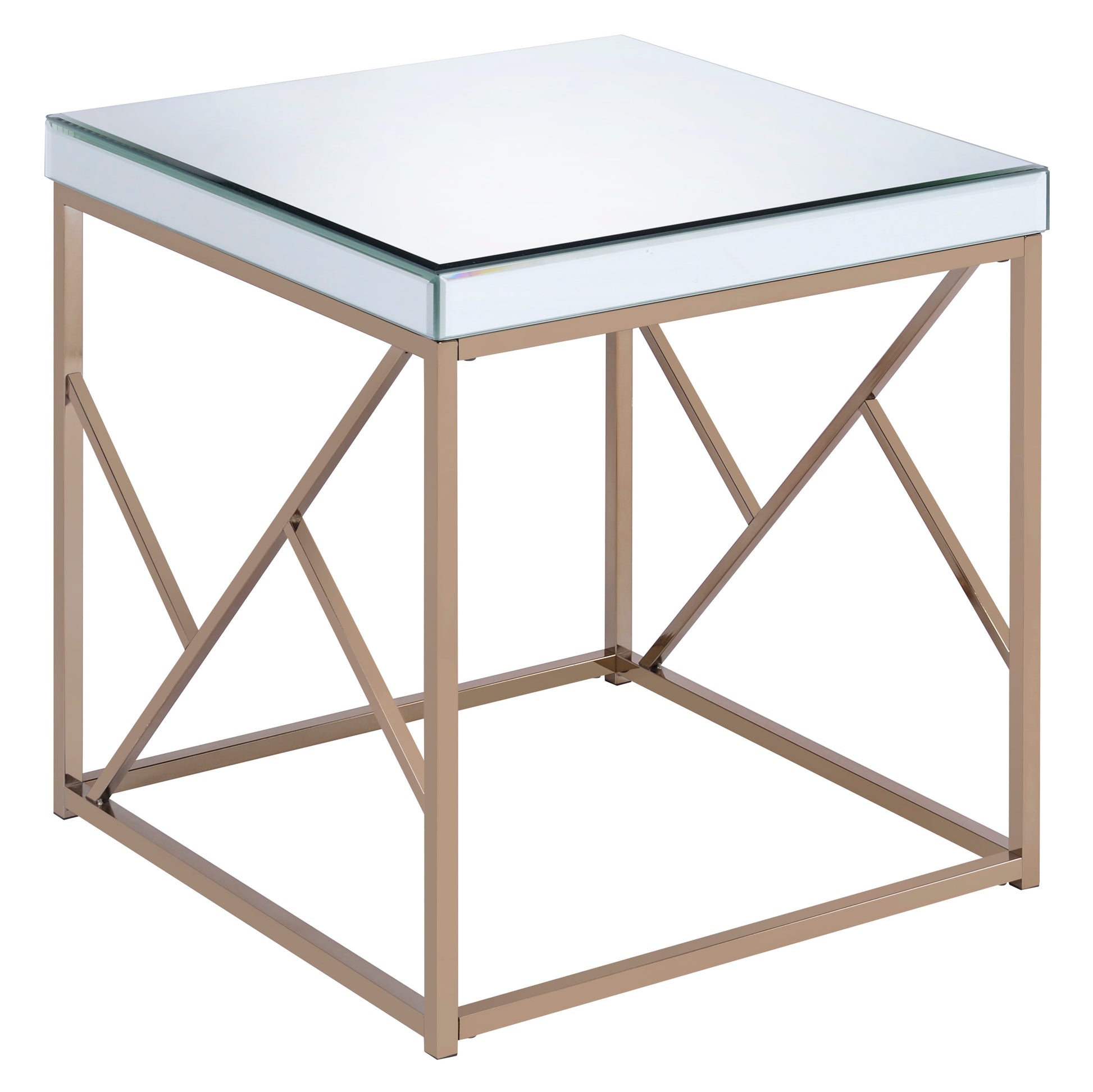 The Evelyn set offers modern elegance with its geometric base design and boxed mirrored top. You will enjoy how the light bounces off the table top and apron Rail to create a larger more vibrant space. The mirrored table also features a sturdy iron base that is finished with a unique copper chrome.