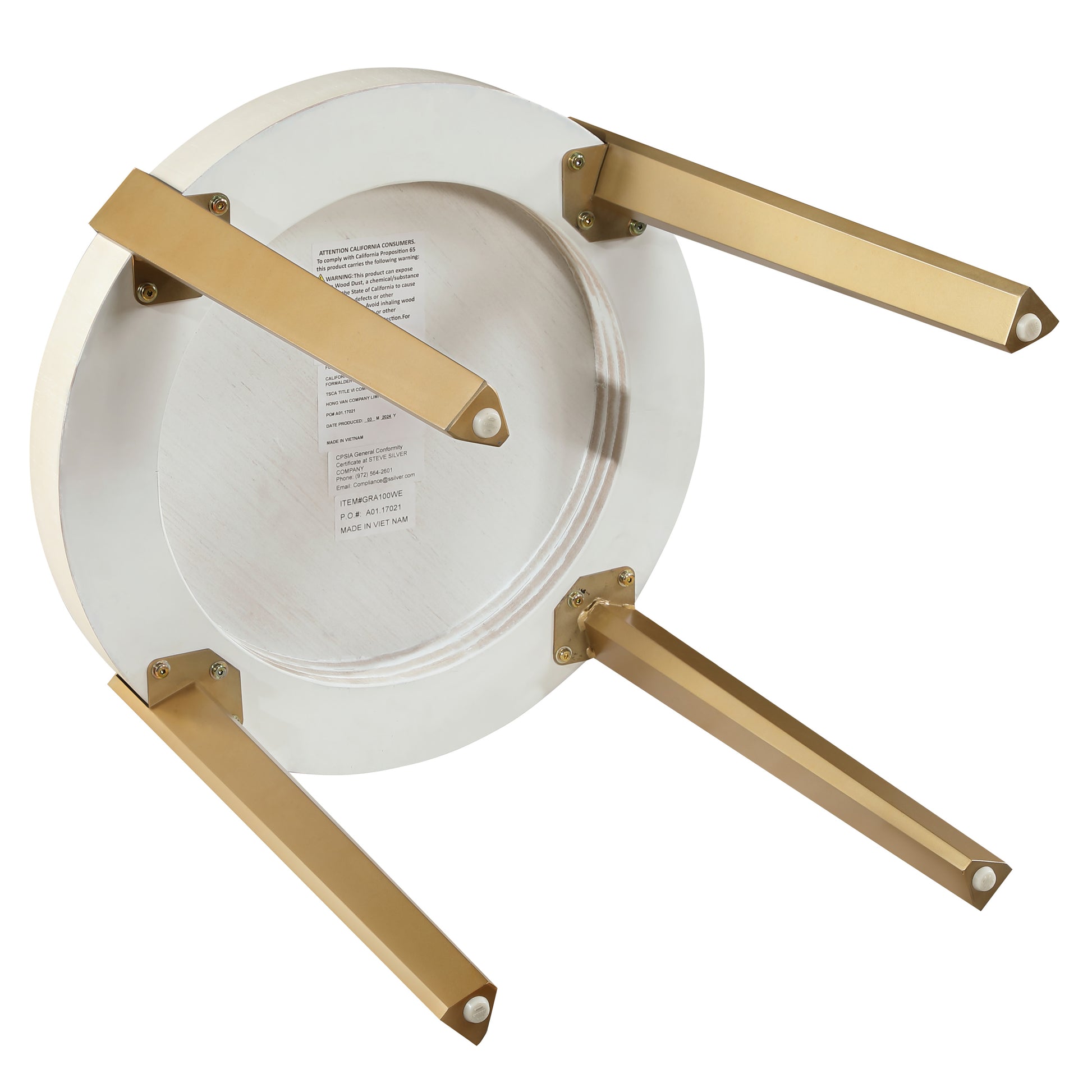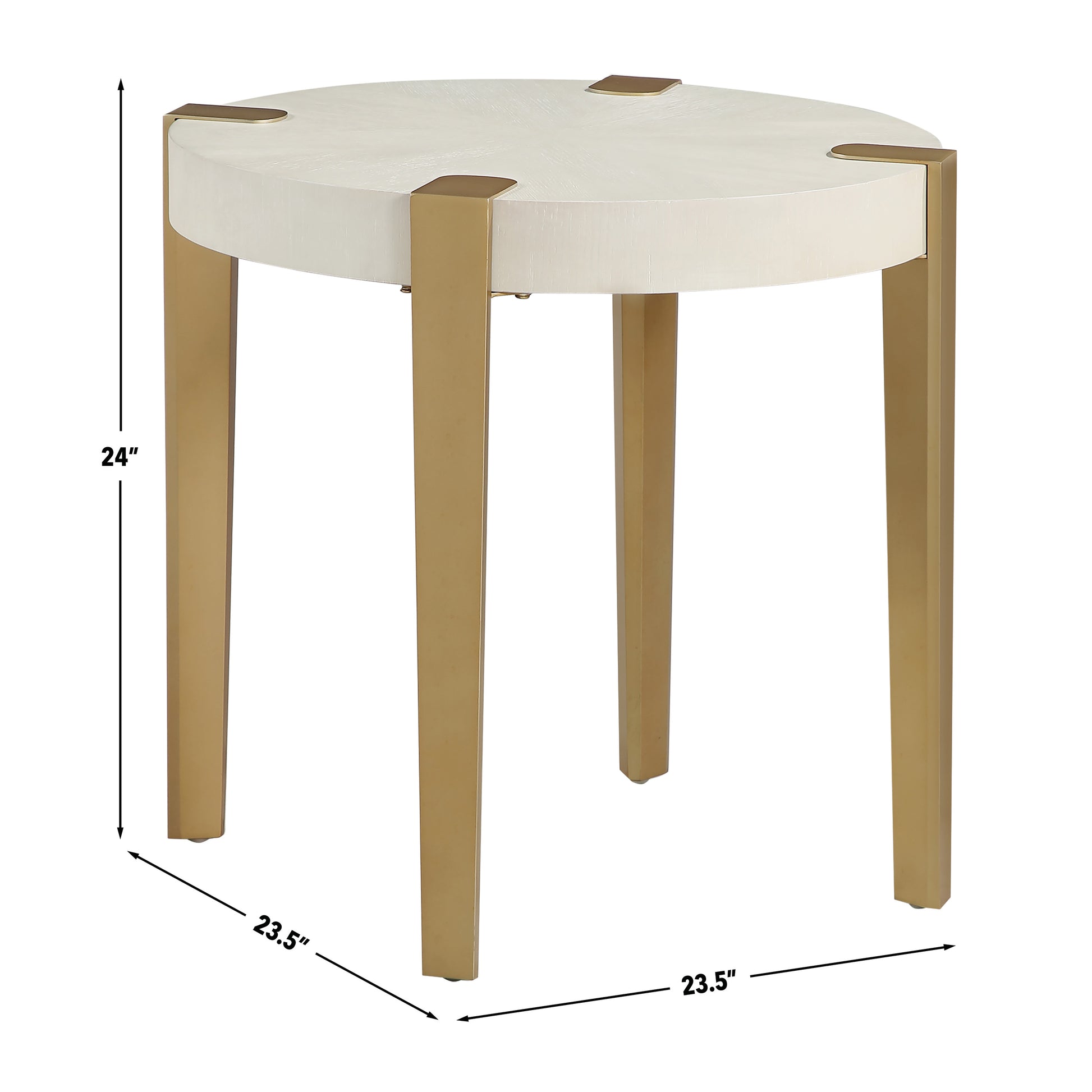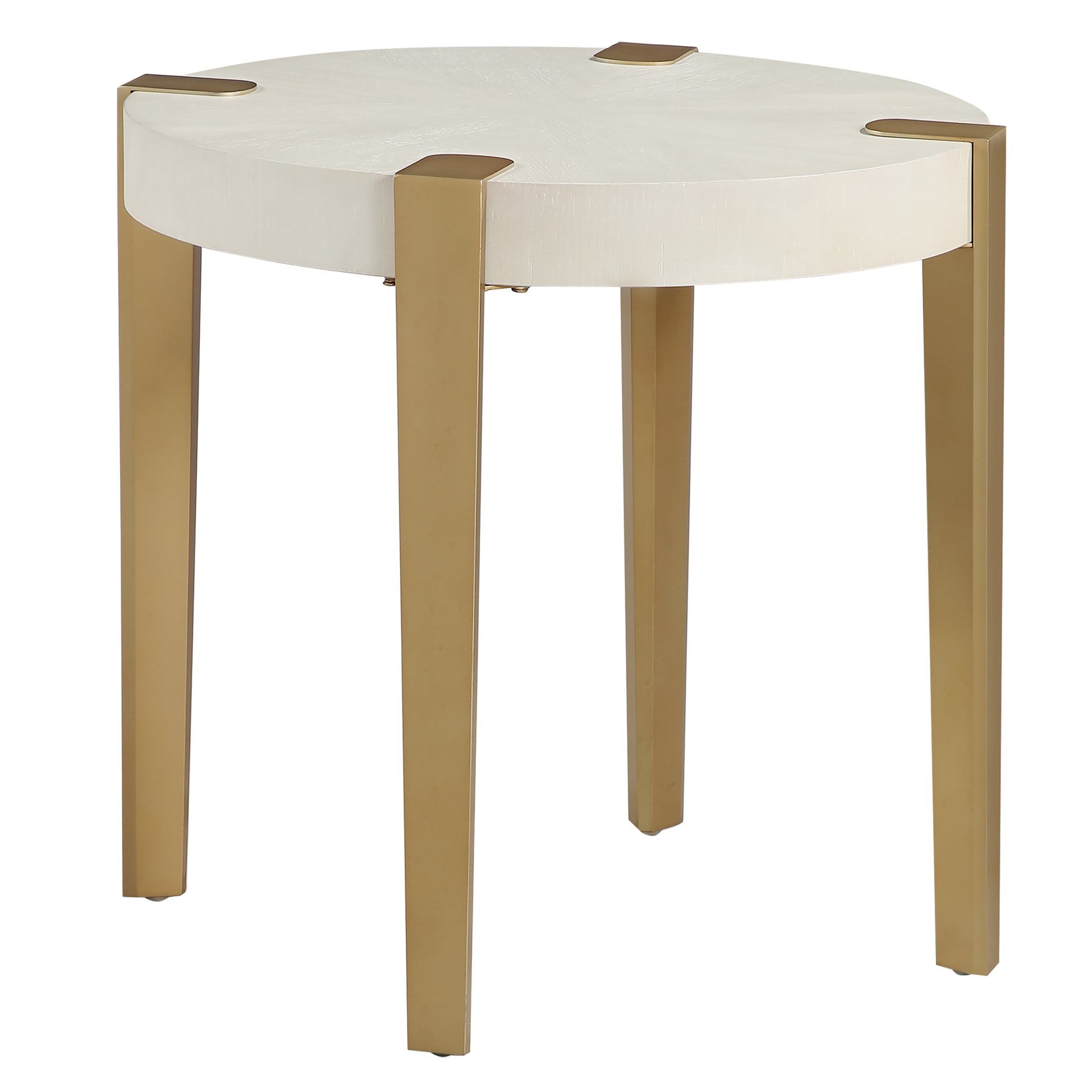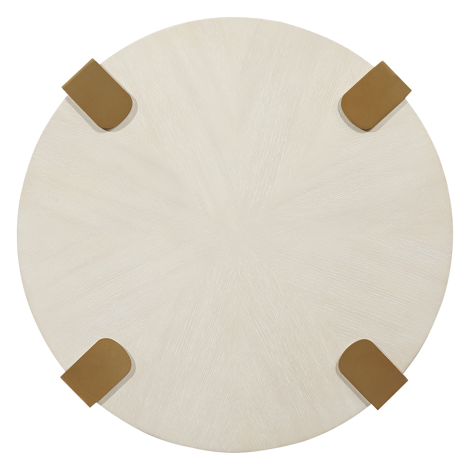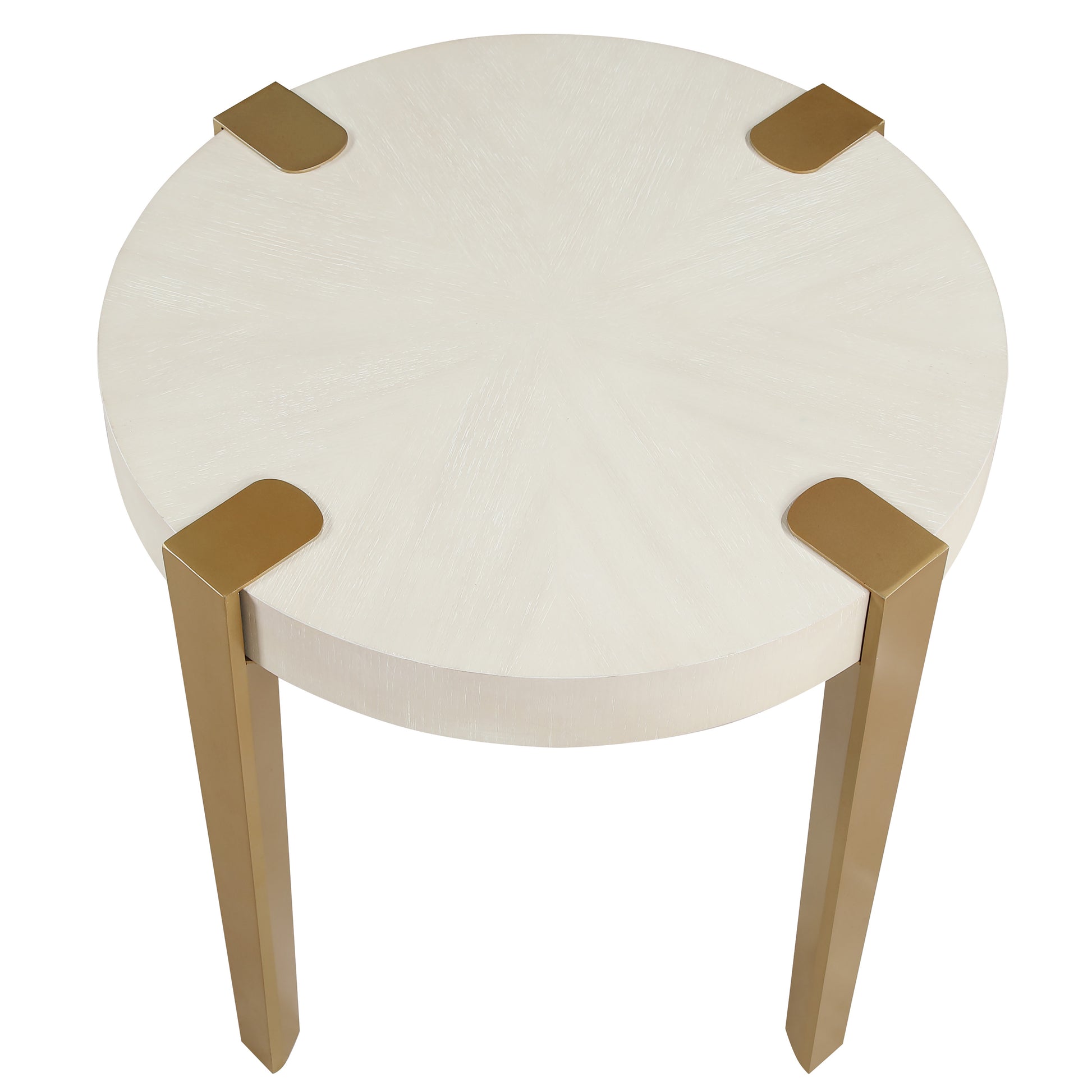 The Gracie White End Table is a stunning blend of modern industrial charm and elegant design. With a round, flowing silhouette and washed white finish, it showcases oak veneers in a mesmerizing sunburst layup. The satin gold finished metal legs, geometrically shaped and exposed on top, add a bold, contemporary look. Ideal as a side table beside a chair or between upholstered pieces, it brings style and functionality to any room. Light and airy, this distinctive piece brightens up any space with its impressive design.