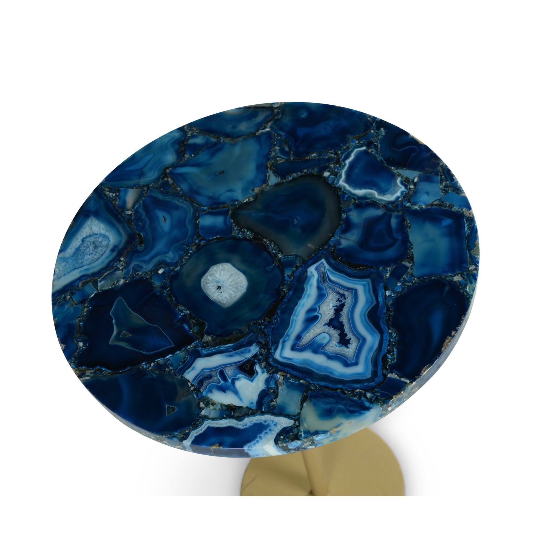 Add a splash of luxury to your space with the Ocean Server Chairside Table, a striking blend of elegance and artistry. The tabletop features a vibrant faux blue agate design that mimics the mesmerizing beauty of natural stone, offering rich swirls of deep blue, cobalt, and hints of ivory. Perched atop a sleek, satin gold pedestal base, this table effortlessly elevates any room.