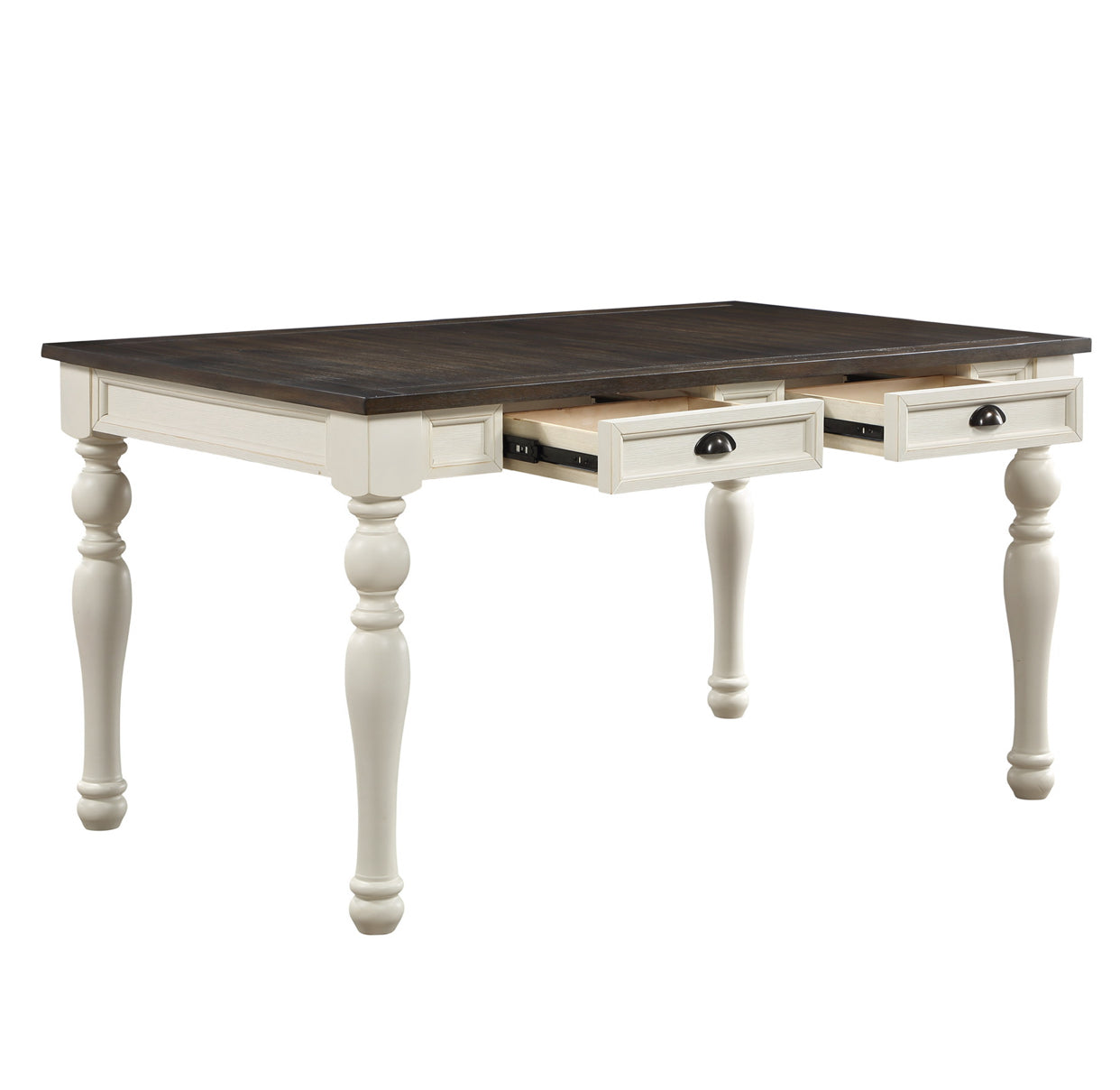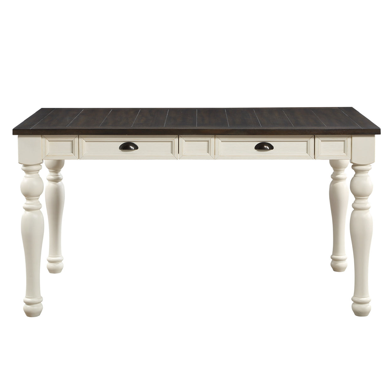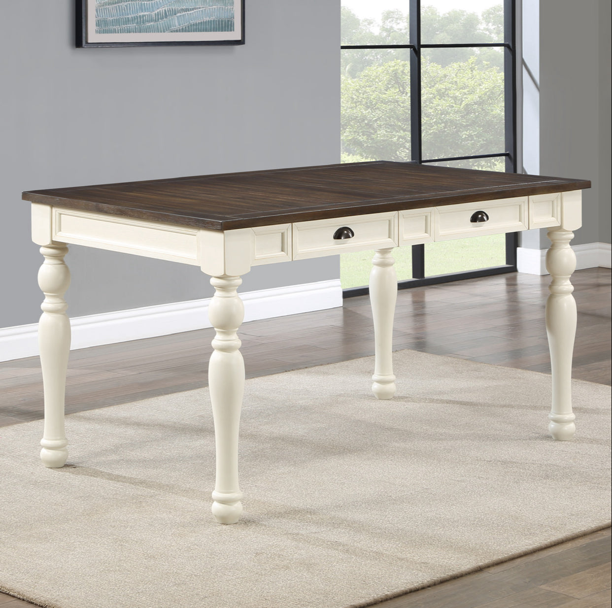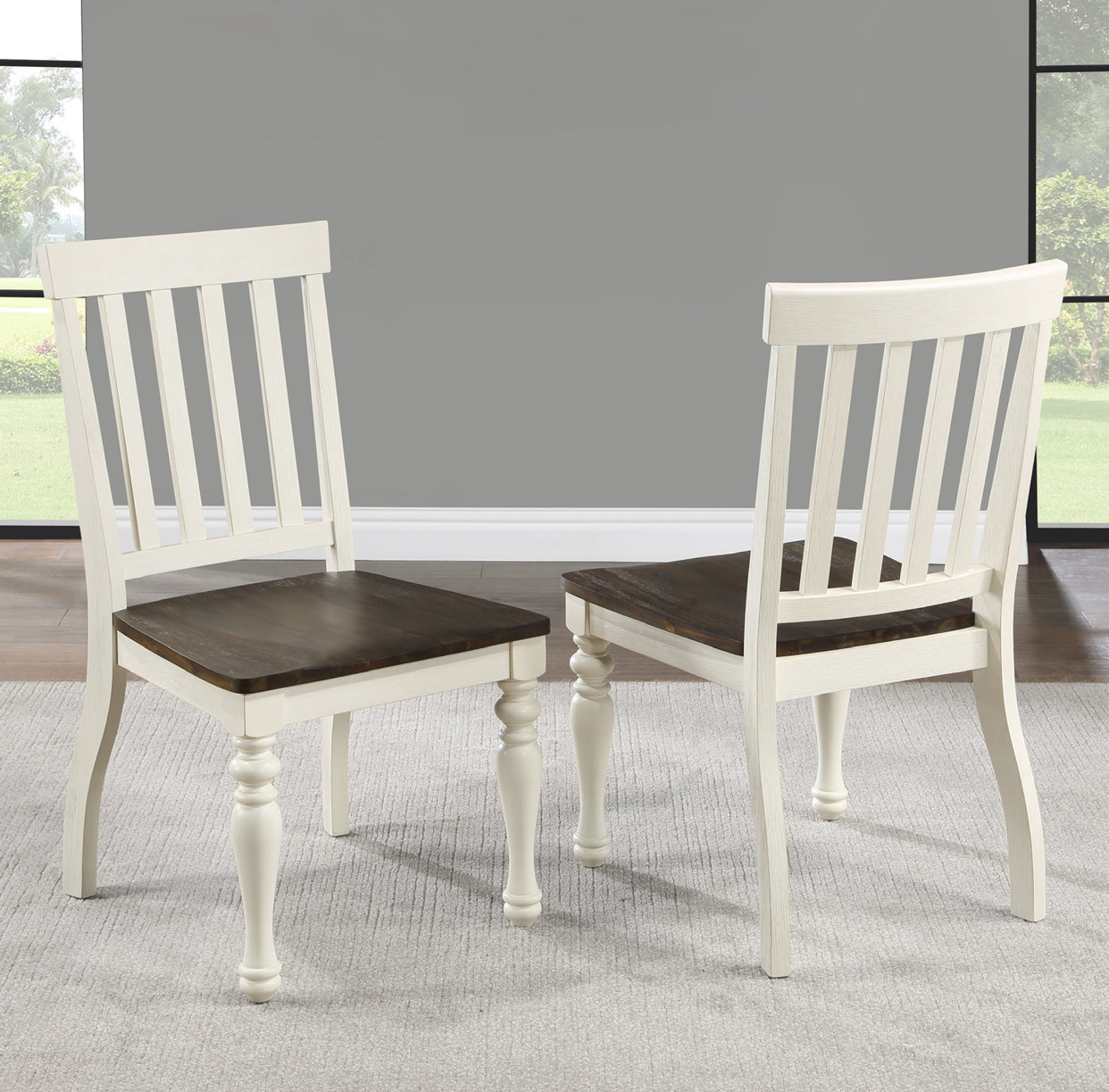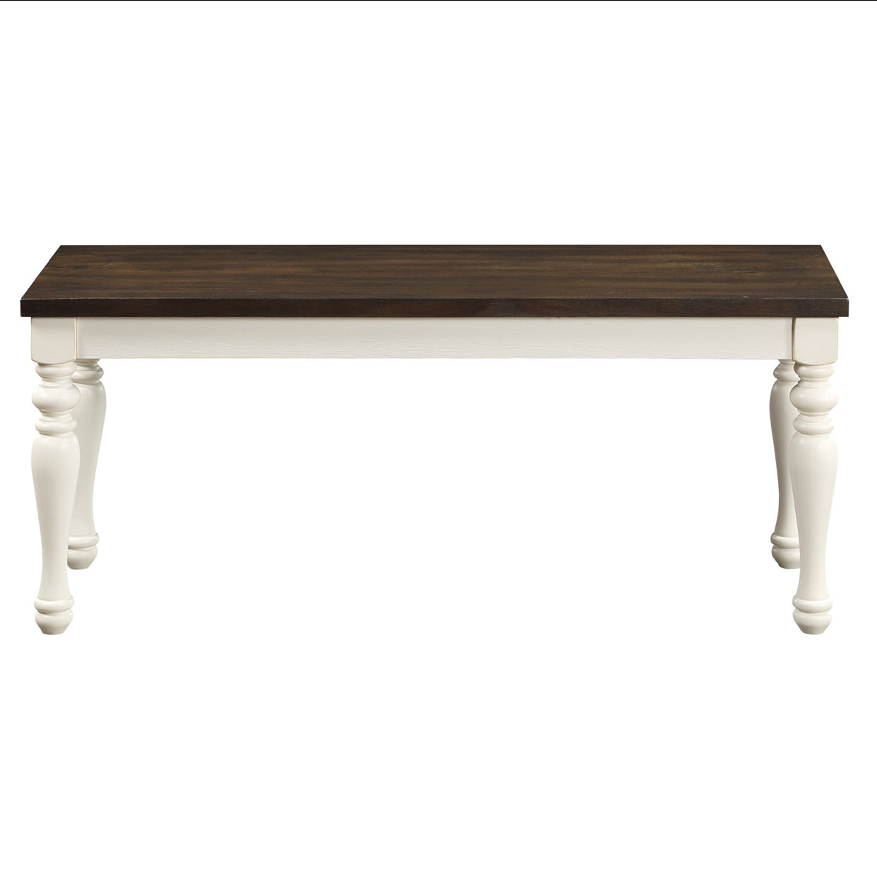 Rustic Charm Two-Tone Dining Set: This inviting 6-piece farmhouse-style dining collection features a warm mocha and crisp white finish, blending cozy elegance with modern simplicity. The set includes a sturdy dining table, four comfortable chairs, and a versatile bench, perfect for gathering loved ones. Its two-tone design highlights natural wood textures and clean lines, creating a timeless, welcoming centerpiece for any dining space.