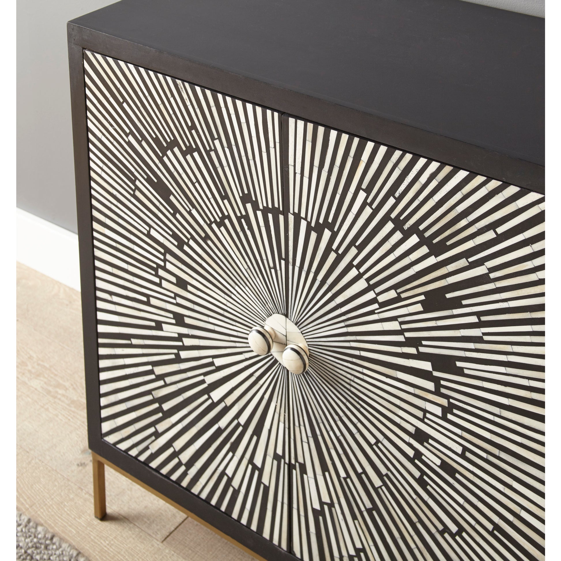 Make a bold statement with the Luna Burst Bone Inlay Cabinet, where modern artistry meets timeless craftsmanship. This striking accent piece features a mesmerizing sunburst design meticulously hand-crafted from bone inlay, radiating from dual circular knobs at the center. The sleek black frame and warm brass-finished legs add a sophisticated edge, making it a standout addition to any room.