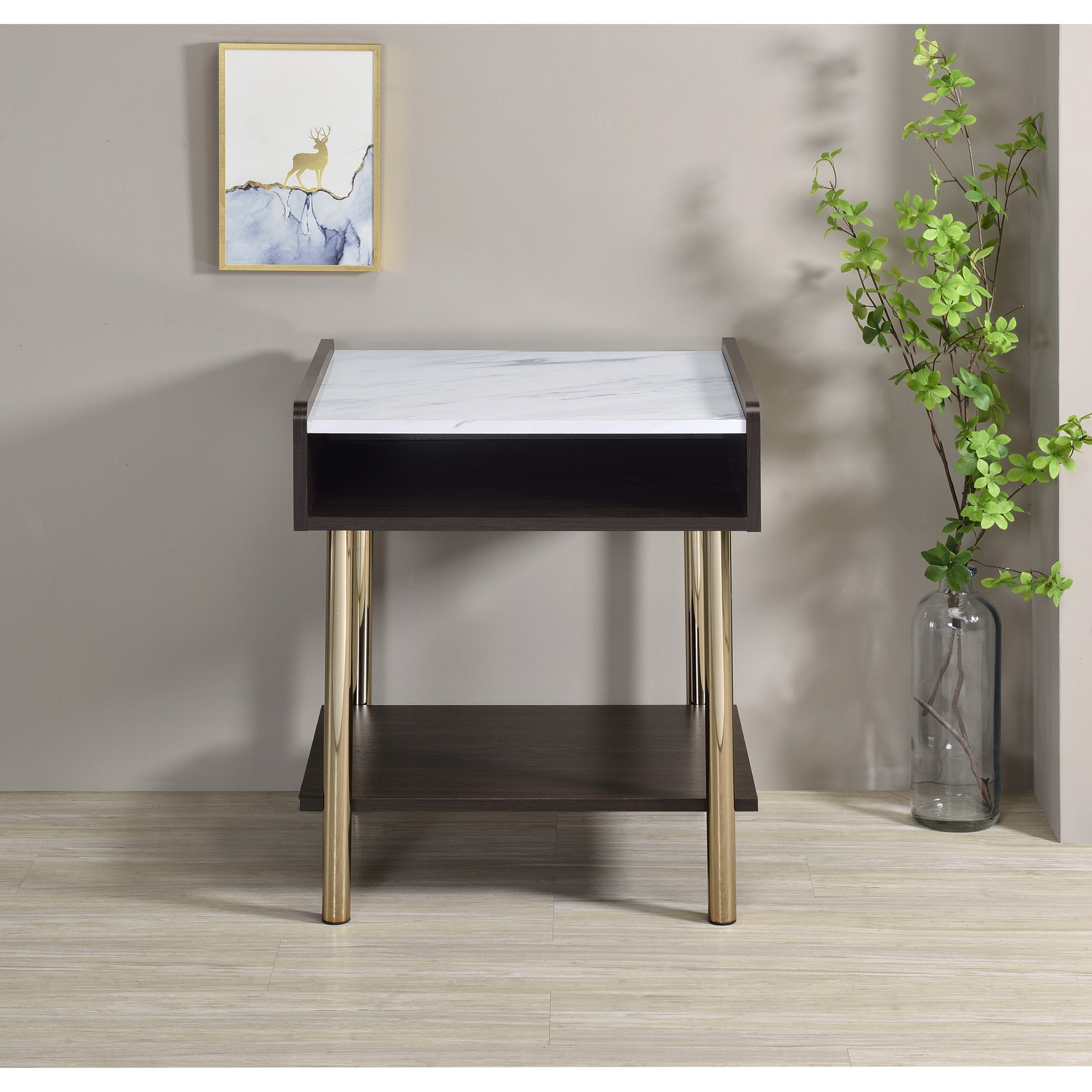 The Metro End Table blends modern elegance with everyday functionality, making it a standout accent piece for any living space. Featuring a sleek faux-marble top framed in rich dark wood, this table exudes sophistication. Slim gold-toned metal legs provide a touch of glam while ensuring stability. The open lower shelf offers extra storage or display space, while the open cubby beneath the tabletop keeps essentials close at hand. Perfect beside a sofa, armchair, or bed, the Aurelia adds style and practicality to your home décor.