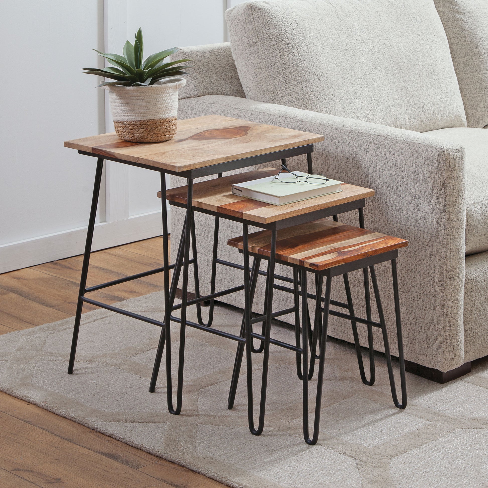 The Tristan nesting table set, crafted from Sheesham wood sourced in India, showcases a natural finish that highlights the wood's unique grain, complemented by a striking two-tone top that celebrates nature’s beauty. Featuring a stylish iron base, these three versatile tables—perfect as the "Tristan End Table"—offer functional storage and timeless elegance.